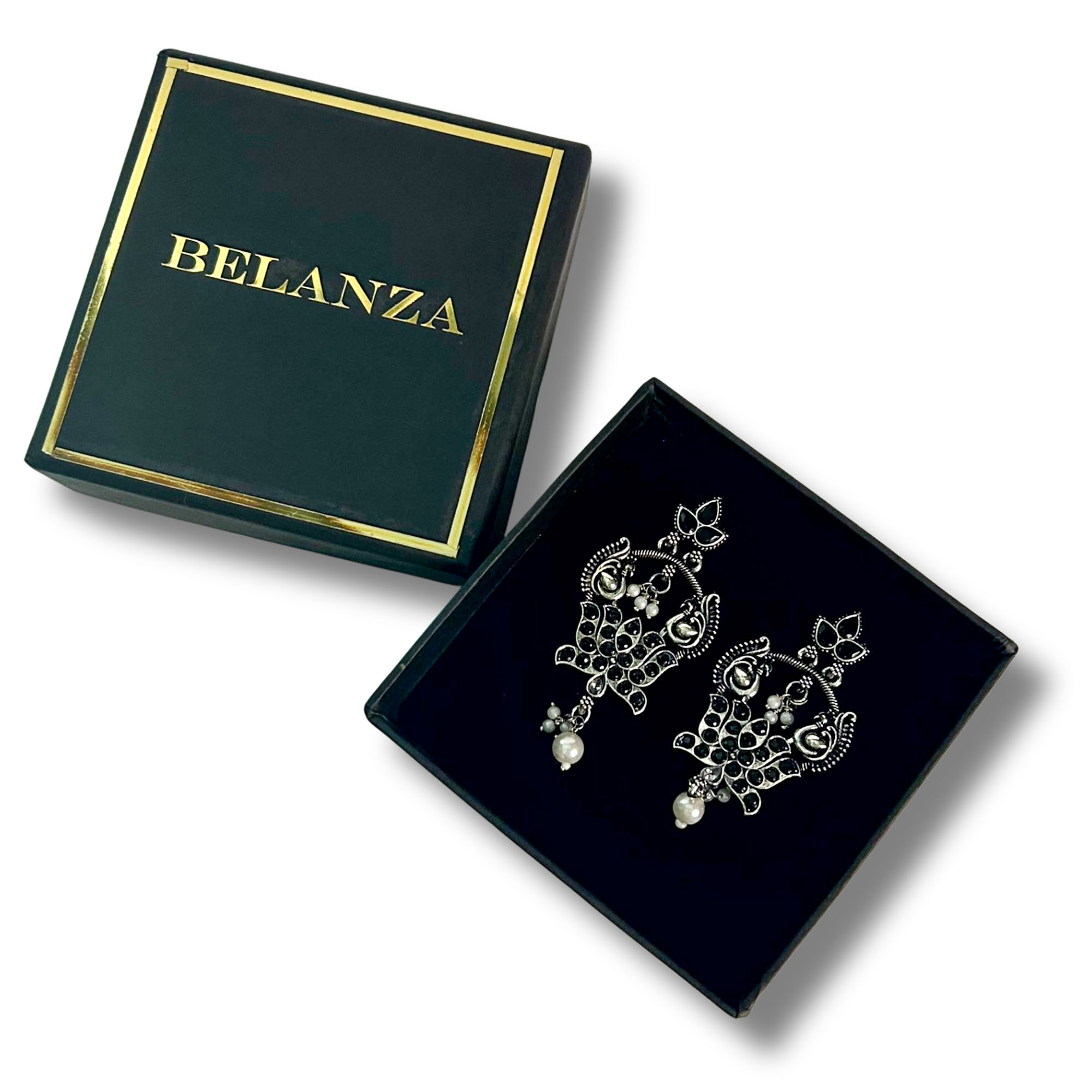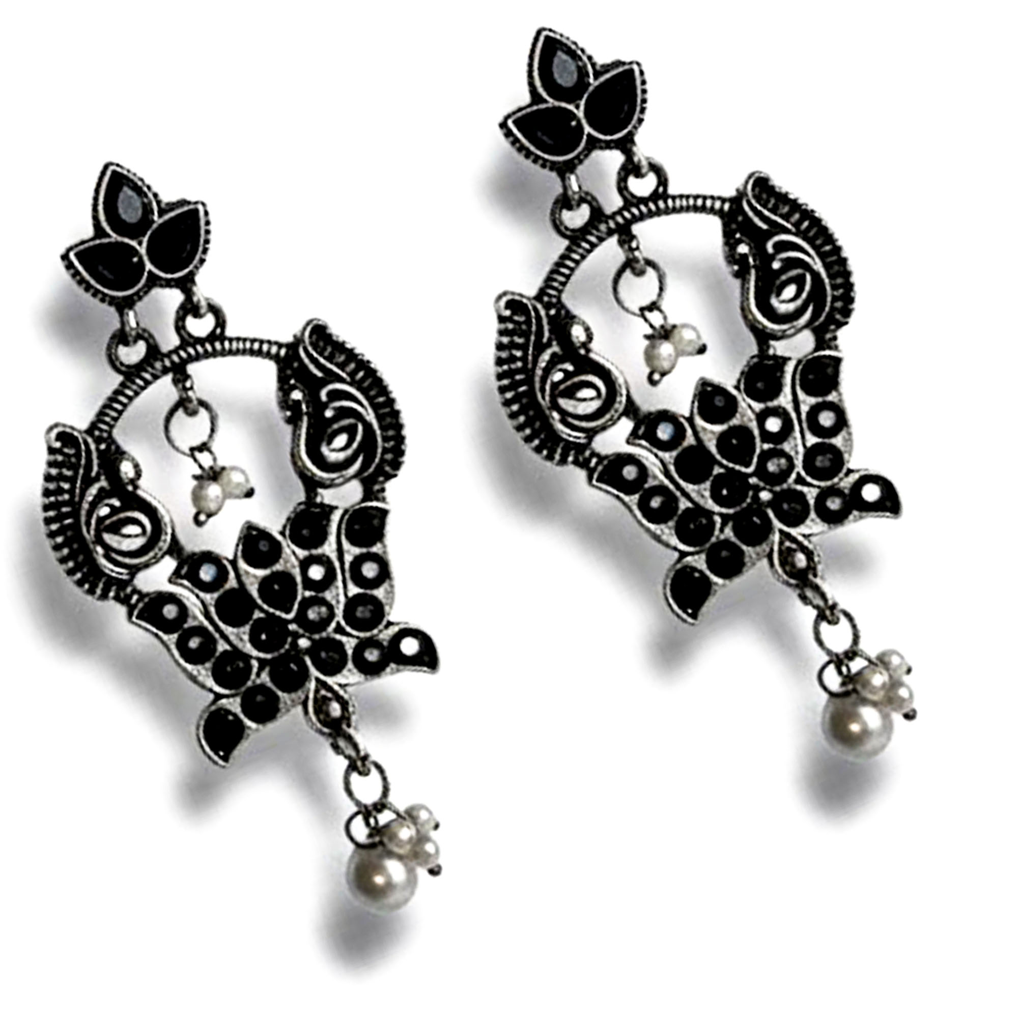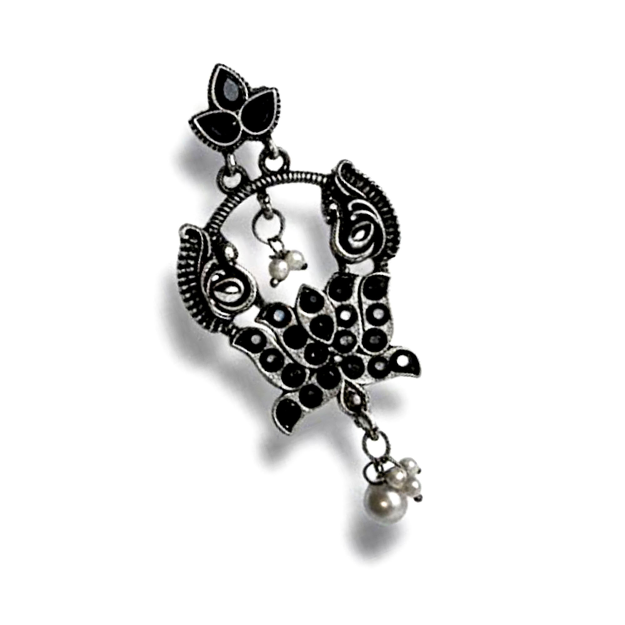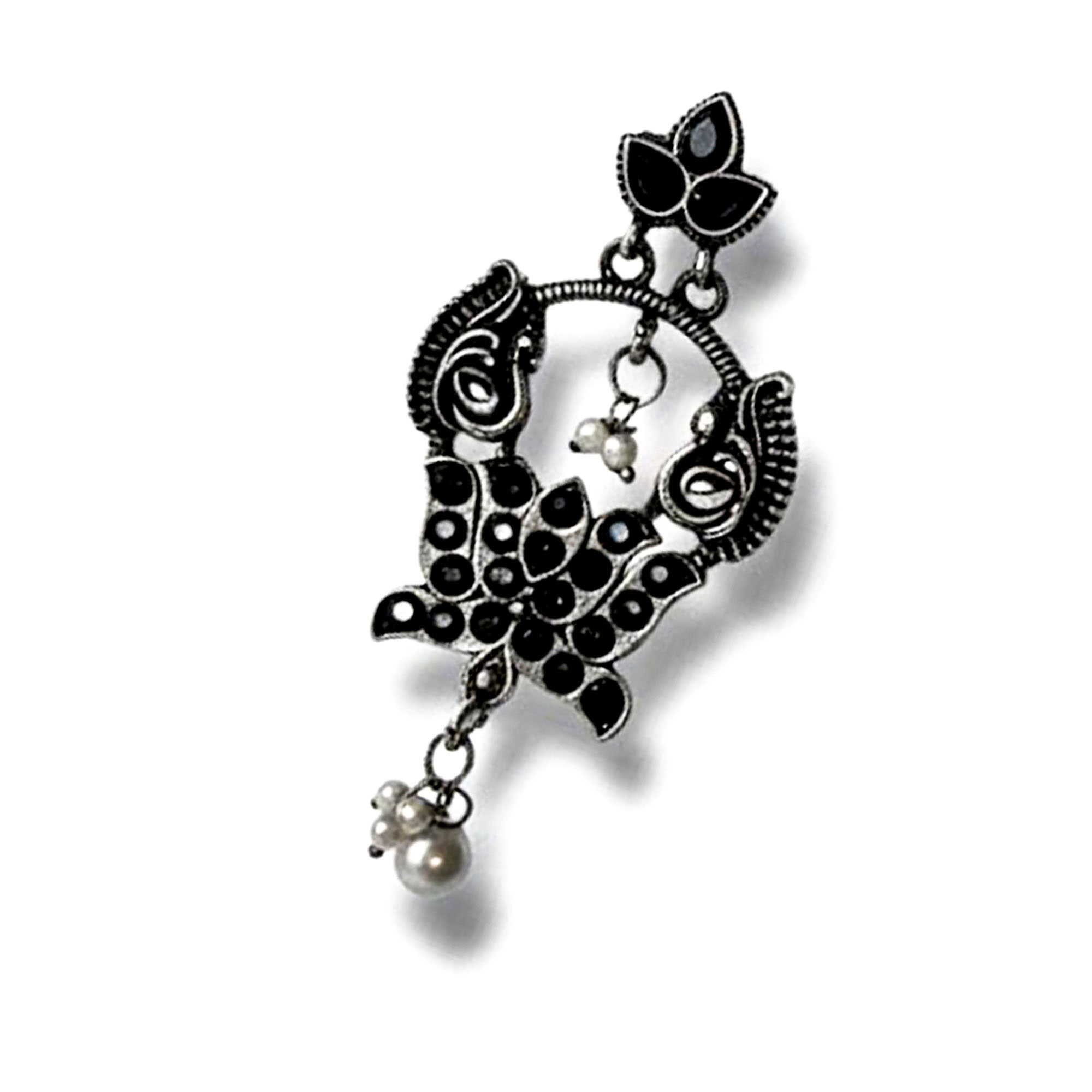Elegant Belanza Black Green Earrings featuring a premium oxidized silver finish and delicate pearl drops. Lightweight, anti-tarnish, and perfect for festive or everyday ethnic looks.