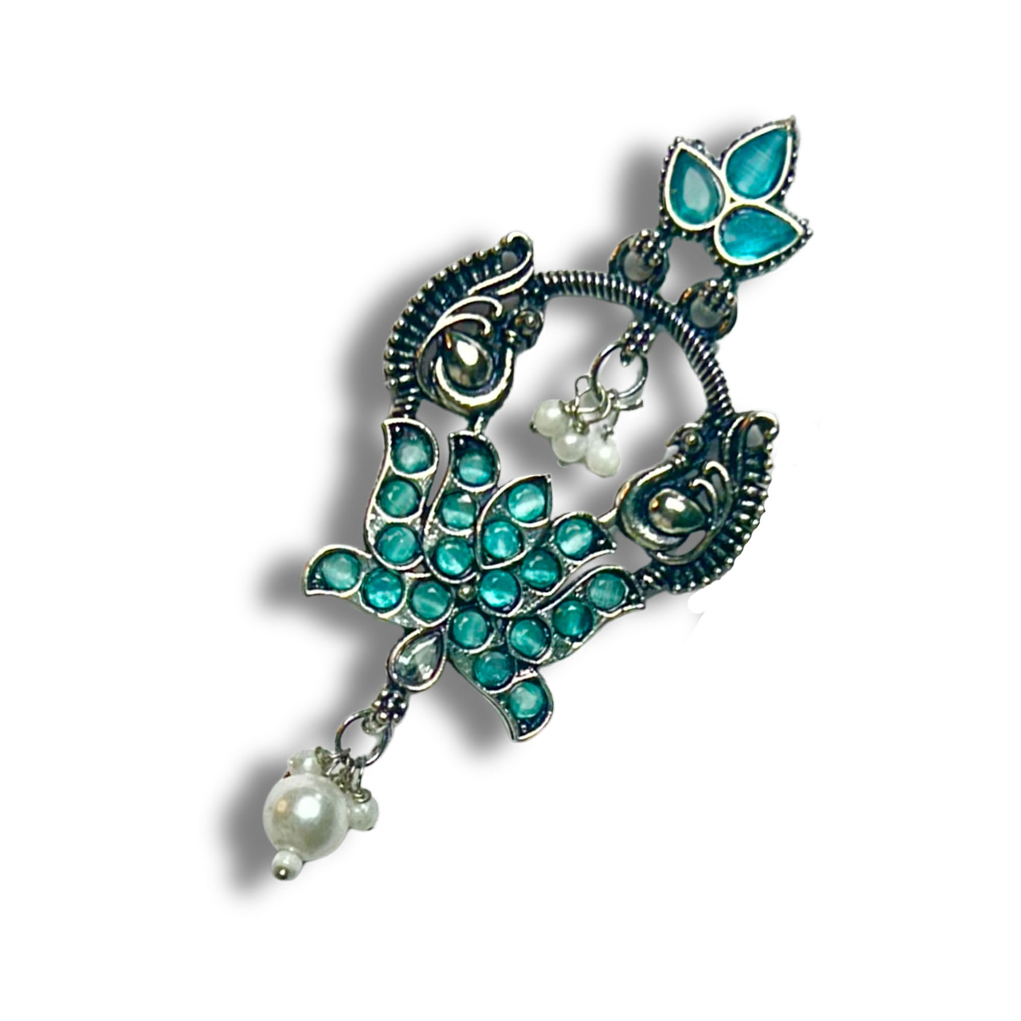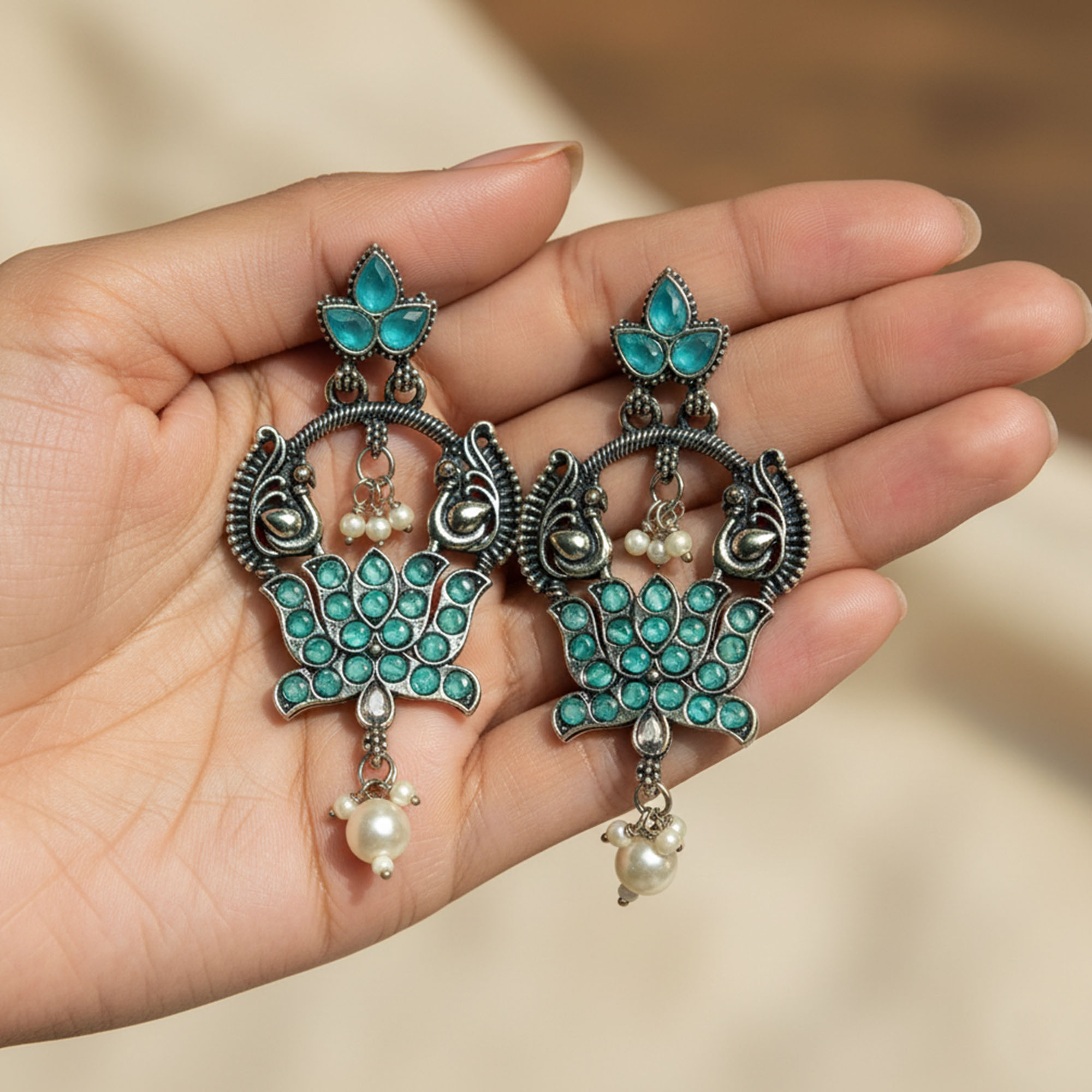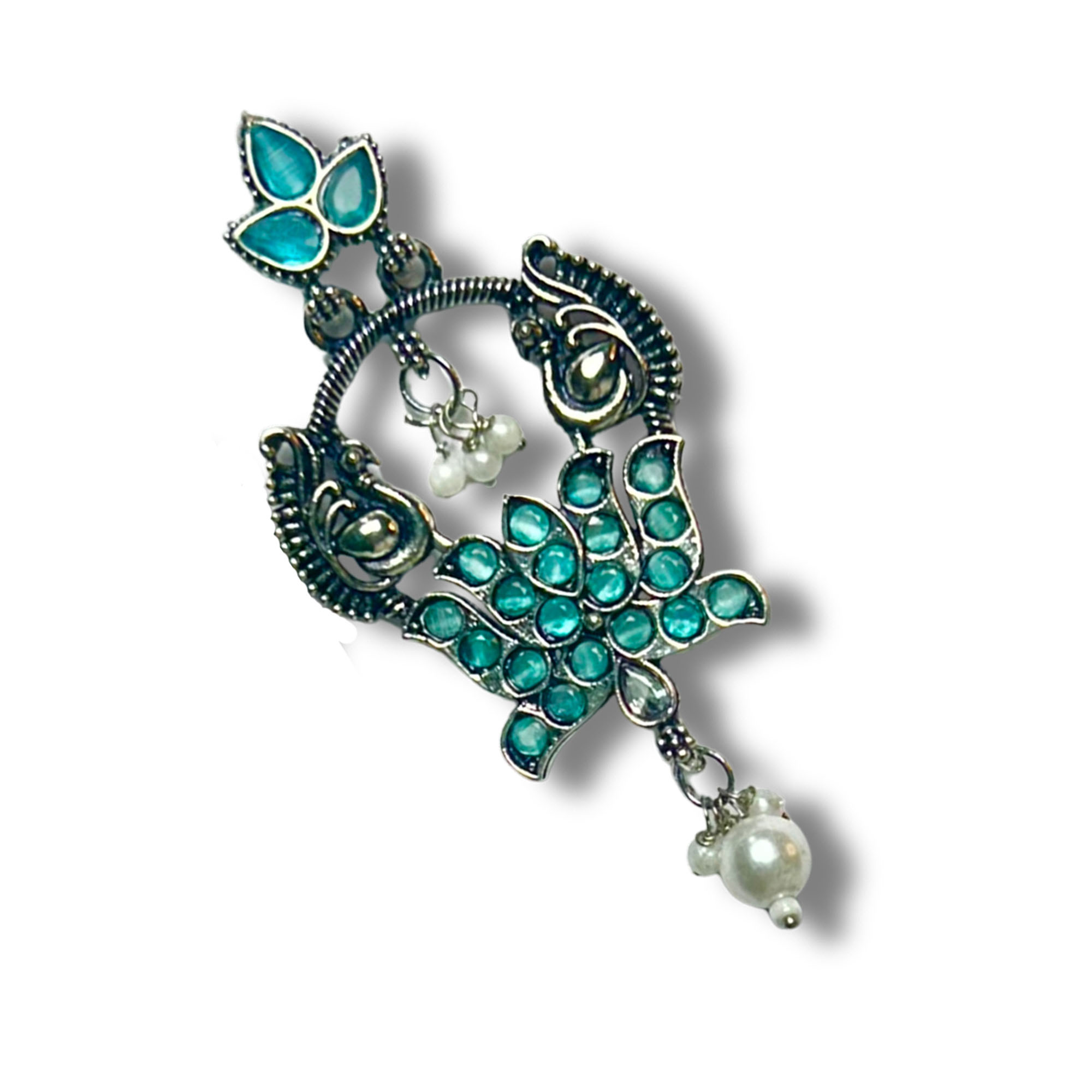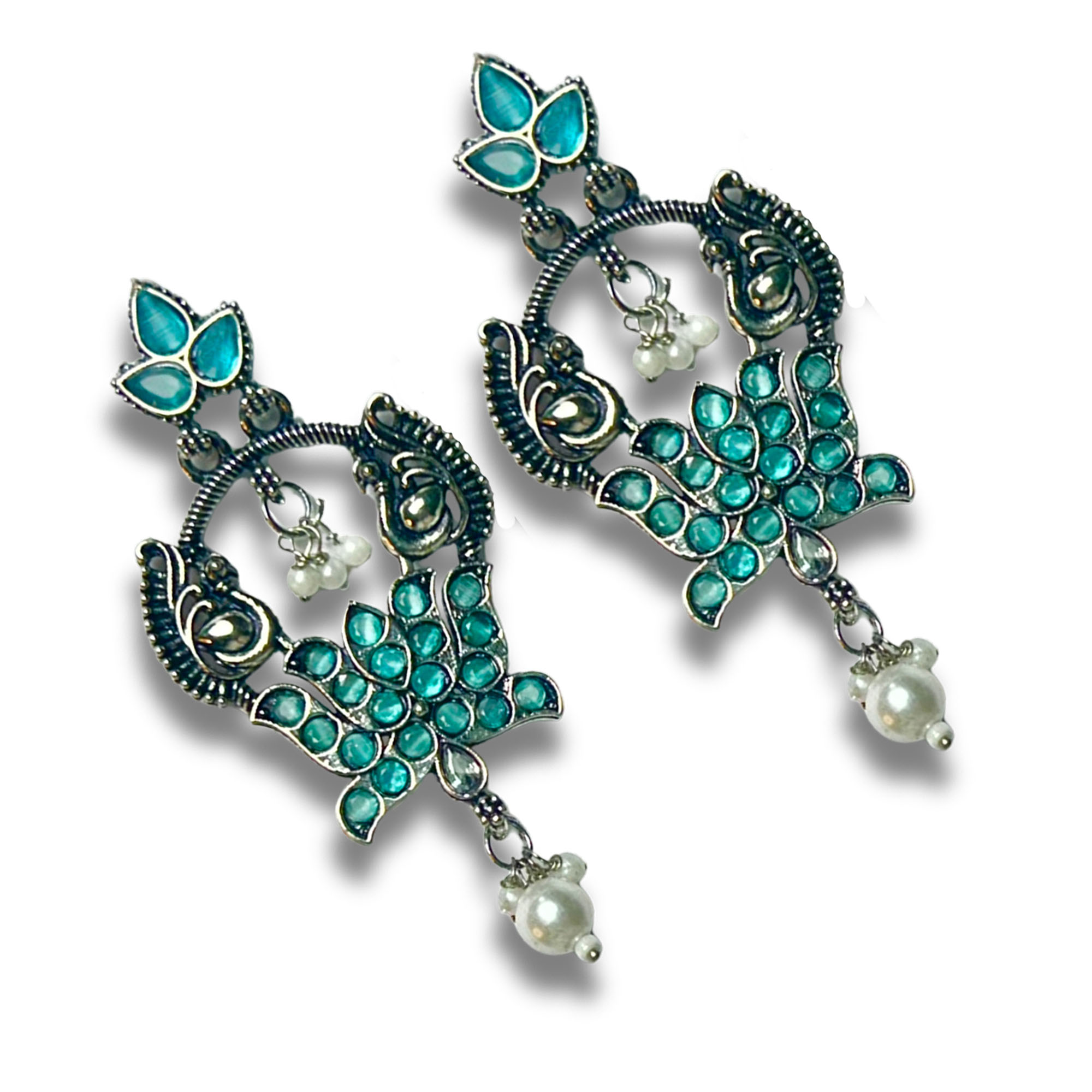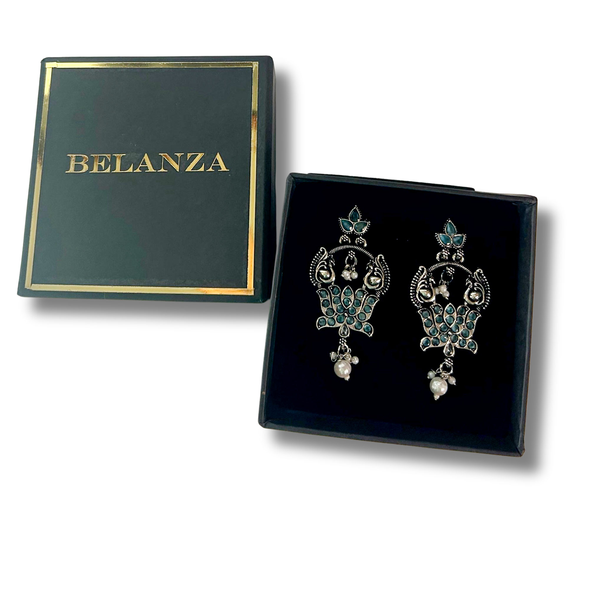 Elegant Belanza Nug Green Earrings featuring a premium oxidized silver finish and delicate pearl drops. Lightweight, anti-tarnish, and perfect for festive or everyday ethnic looks.